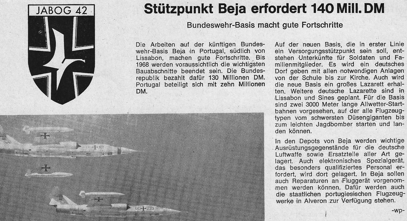 Ergänzende militärische Forderung nach dem Bau eines (Flug-) Schießplatzes. Die Zentrale Deutsche Verbindungsstelle in Portugal (ZDVP) wird in Lissabon/Damaia errichtet. Sie besteht aus der militärischen Kommandobehörde (ZDVP/Kdo) und der Bundeswehrverwaltungsstelle (ZDVP/Vw). Der Militärflugplatz Beja wird am 21. Oktober 1964 eröffnet. Zum 21. Oktober finden er Jahre regelmäßig Veranstaltungen statt.